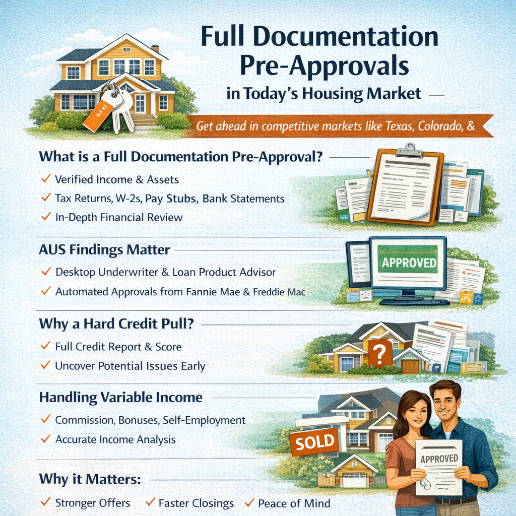 In today’s market, sellers and listing agents pay close attention to the quality of a buyer’s pre-approval letter. A full documentation pre-approval with positive AUS findings signals that you’re a serious, well-qualified buyer who is far less likely to have financing fall through.